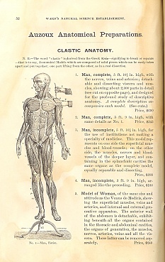 Description: 4’ tall paper mache like anatomic model of a woman. Dissected beneath the skin, chest comes off to reveal individual organs. Faithful anatomic detail, mounted on a metal base with a rod. These anatomic figures were developed by the French Physician Louis Thomas Jerôme Auzoux (1797-1880), . They are described in the Catalogue of Human Skeletons, Anatomical Models (ref 237) from 1862. Another page shows the 5 foot tall man, the female is life size.