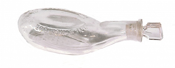 Description: 6“x 2“x 2” black box with label on inside lid Chloroformisateur pour l’anthsie par le chloroforme a doses faibles and continues with testimonial about pharmacist Adrian. Contains a 5” x 1.25“x 1.75” bottle like a nurser with a glass stopper and embossed Chloroform, anesthesique, Adrian, Paris.