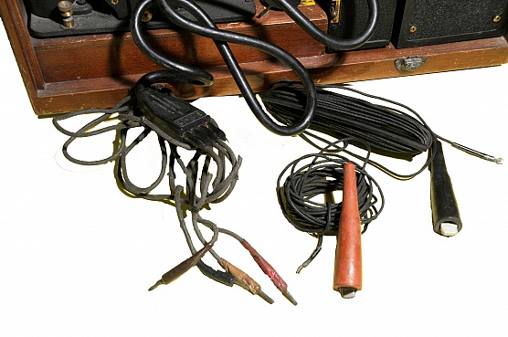 Description: Wooden case contains a string galvanometer with magnets in housing, knob to adjust string. The case is 19” long, 10.5” high and 8” deep. With the top closed the height adds 4”. Light shines through housing to enter a box containing light sensitive paper. A mirror reflects a scale into the box as well and paper advances into a drum, which can be closed and removed. There is a counter. The lowest patent number is 1702650, which corresponds to a date between 1929 and 1930. There is a gear mechanism to advance the photographic paper and a counter and a timer wheel. Some of the original wiring is in the compartments. Extra compartments in the lid of the box are empty but held electrodes and wiring and extra materials. There is an on-off switch in the front of the device.Jump The Dutch physician Willem Einthoven (1860-1927) invented the electrocardiogram (ECG) in 1903 and received the Nobel Prize for the invention in 1924. The abbreviation EKG refers to the German spelling of the name. His device was the string galvanometer that detected the small amounts of current arising from contraction of the heart. The string galvanometer was replaced by the vacuum tube amplifier in the late 1930’s. We now use transistors and solid state circuitry.