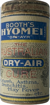 Description: 4 1/8” x 2” wooden box contains a liquid and a device to deliver it. The reverse side reads Booth’s Pocket Inhaler Outfit, contains one bottle of Hyomei. Label claims it cures catarrh, asthma, bronchitis and hay fever.