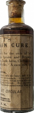 4 1/4” x 1 1/4” eleven sided bottle, for internal and external use in painful conditions.. An interesting cure bottle, but not mentioned in the usual references or on the internet.