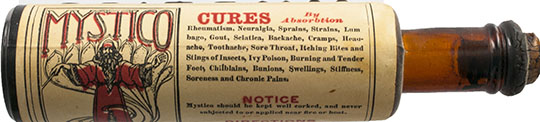 4 7/8” x 1 1/8” round bottle with nice illustration. Embossed mystico. For external use, “cures by absorption”. Another rare and valuable bottle that was missed by the reference books, but there is some mention on the internet.