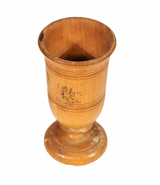 Description: 5 “x 2.5” wooden cup shaped like a goblet. Label on front says For Fever and Ague, Dyspepsia, Piles, Indigestion, Headaches and Debility Quassia Mara, Discovered in 1756 by a Negro slave named Quassia, Dr. G.G. Adams. Label on bottom of cup says for dyspepsia and indigestion, use before meals for piles, use a inch of Lac Sulpur in water 2 or 3 times a day for worms let the water stand in cup. See another example.