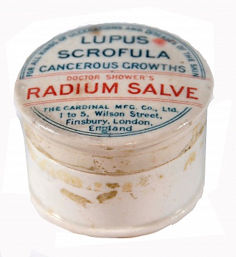 Description: Porcelin salve pot 2“x 1.5” reads for all kinds of ulcerations and diseases of the skin, lupus, scrofula, cancerous growths, Doctor Showers Radium Salve and name of mnfr.