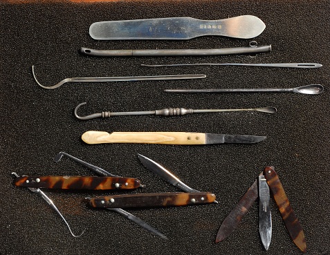 Description: Contains silver tongue depresor hallmarked SC and Co. with a crown, siver catheter, blunt probe, grooved aneurysm needle, grooved scop, silver tenaculum and bone handled lancet. These are displayed in a hand made frame that was given to me by a friend. Case also contains hook, lancet, curved probes, blunt probe. Originally ontained in a 6×3” red leather case marked Maw. These pocket cases were a basic part of the physicians armamentarium in the nineteenth century.
