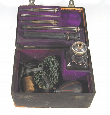 Description: 7.75×5.25×5” box with purple velvet lining and manufacturer tag. Top layer contains the handle and 4 cautery instruments.There is a glass bottle and the pump with rubber tubing is contained in the base of the box. The set is complete. See another.
