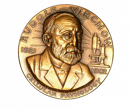 Description: 1.75” commemorative medal with picture of Rudolf Vircho on one side, cellular pathology, 1821-1902 and picture of microscope, other side shows a post mortem, omnis cellula e cellula and it also says post mortem, made of bronze.