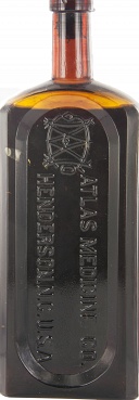 9“x 3“x 2” molded amber bottle with lable, for diseases of kidney, liver and urinary organs. Embossed on back Atlas Medicine Co. Henderson N.C. USA with an elaborate emblem
