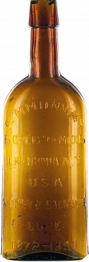 8 1/2” high brown bottle with an elongated oval shape. The total width is 2 3/4” and the maximum thickness is 1 3/8”. Embossed on the front of the bottle si Dr. M M Fenner’s Peoples Remedy, Fredonnia NY, USA, Kidney and Backache, Cure. Dates at the bottom of the front are 1872-1898. The product clearly predates the pure food and drug act of 1906 that put an end to the use of the unsubstantiated cure claims on many bottles. After that the word remedy was substituted.