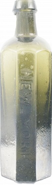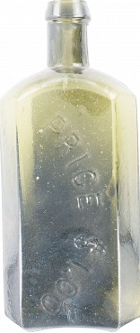Olive green rectangular, beveled edges, pontiled 7.5“H 3 1/8” W 2 1/16“D tapered collar, mint, American