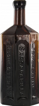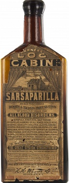 9“x 1“x 1.25“x 1.25“x 1.25” x 1” x 3.5“six sided bottle with label with a picture of a log cabin All blood disorders. This company is also known for its “Safe Cures” . A small sample bottle labelled log cabin liver pills is shown here also (2 1/4” x 1/2”).