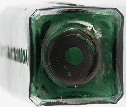 7.5“x 3“x 3” square, tapered from bottom to top, rounded on top with applied lip,1.5“x1” beautiful emerald green to bluish green color with iron pontil, which is quite large.