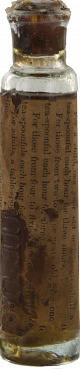 Aqua, label 70% complete, cylindrical, open pontil 3 3/4” H 3/4” D, rolled lip, mint with contents, American, rare with label