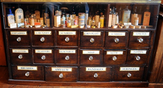 Description: 16 drawer apothecary cabinet with glass covered labels, cut glass knobs. Modified to have a shelf on the top divided into three parts. 50“x 31“x 9.” Made of dark brown mahogany. Brass fitting on top shelf. The original is the cased drawers that were removed from an old English pharmacy and then modified as shown. The empty cabinet is shown and also an image of the cabinet as modified a large number of old labeled bottles with contents in the compartments above that were added. Various antique medical items are displayed on the top when it is in use.