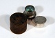 Description: 7/8” x 7/8” circular nickle plated bottom is a cylindar intowhich the top fits snugly so that if a pill is in the bottom it can be crushed by the top piece. The whole fits into a circular box 1.25“x1” high.