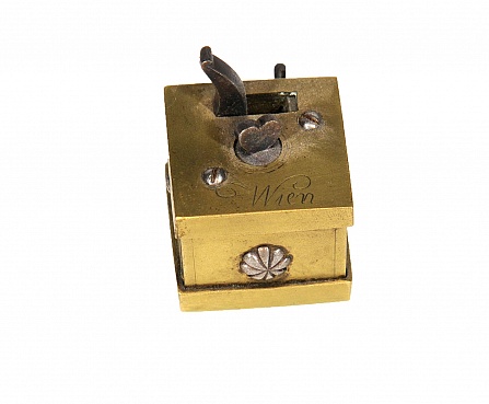 Description: 1.3” square bleeder, sixteen blades. Wein engraved on top in a fancy script .Brass, no lacquer, no mnfr name. This very small example may well have been used in pediatrics.
