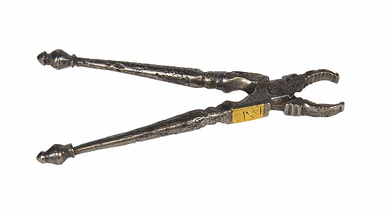 Description: 5” molar extractor of steel with rivet joint. Brass plate or possibly even gold on each arm with a groove claw grip. Date (1714) is engraved on one plate. The other plate has writing as well but it is illegible. It has been suggested by some that these are nutcrackers and not dental instruments. The Museum of the History of Science at Oxford has a number of them one of which is pictured. The British Dental Association also shows one on its website. Finally in the book by Bennion (ref 303, bibliography), a number of instruments are shown on p 51. All are identified as dental forceps. They may well have been of dual purpose, but their use as tooth extractors appears to be unquestionable.