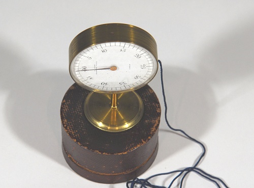 Description: 2” D x .5 brass cylinder with white enamel face calibrated to 50 in units of 5 . Engraving on back on brass Dr. Quains Stethometer, on face Delome, Rathbone Place. String from dial about 25” moves needle. The stand is engraved coxeter, 25 grafton place, the whole disassemble to fit in a cardboard box with the coxeter label.