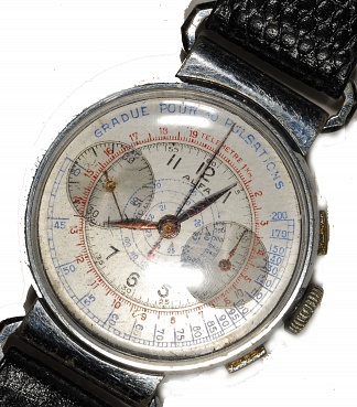Description: 1.25” watch with words “ gradue pour 30 pulsations” on front. Alfa signature. Tachymeter scale as well.The case is made of stainless steel. Initials on back MEF. Movement is signed Alfa with an arrow as well as face. Five jewels are easily visible in the movement with speed calibrated in French and English. Servicing signed 3x, Serial number 246697. Many watches with second hands are labelled “Doctor’sWatch”.But the only ones that are certain for that purpose are those with a calibration for measuring the pulse.