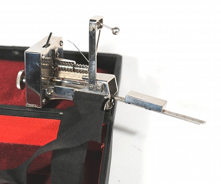 Description: 5× 3“x 2” leatherette case contains device similar to Dudgeons but with 2” rod which extends and has an adjustable weight to adjust pressure rather than screw spring. The body of the instrument is 2” long, there is a 2” sq. clockwork mechanism to turn the smoked paper on a rod drive. No manufacturers marks on the instrument. Case has handwritten letter GAT, very similar to an English model. French?