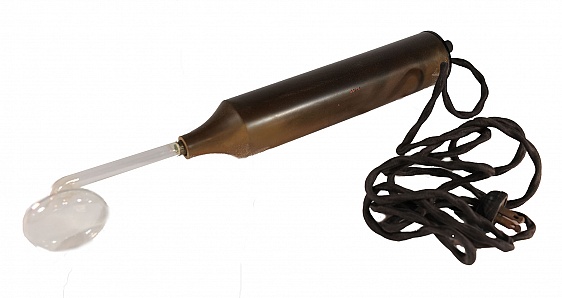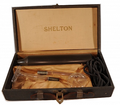 Description: Tesla Coil in a black leatherette case with two associated glass applicators.The apparatus is housed in a black box 12” x 6.5” x 2.5”. There are several glass vacuum tubes in the box. The Tesla coil produces a high voltage, low current discharge that ionizes the gas in the tubes. They glow blue and when held near the body the tube emits sparks that jump the gap. This dramatic effect led to great acceptance and it was used commonly for home therapy of a variety of ills. A web site with a presentation of this device can be found here. Tesla played a role in numerous important inventions and was the “father of alternating current”.
