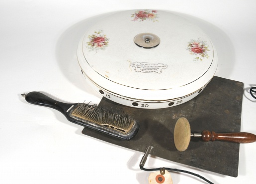 Description: 11.25” x 2h” disk enamelled in white with flowers, fittings on side to insert electrodes labeled A,B, foot plate, 5-40 by 5’s. Patent date May 17, 1904 on top, seal on bottom dated Dec 10, 1912 for inspection, 110 volt direct current, accessories include: 10“x9” foot plate, electric connector to be screwed into socket, brush and sponge holder and circular disk with handle.