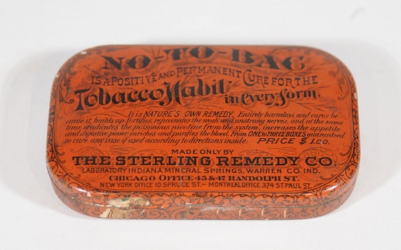 Description: 4” x 2.25” x 3/8” burgandy tin with illustration of a warrior conquering tobacco, various claims and directions, cure claim included.
