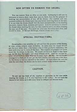 Description: 4.25” x 2.25” x 1” box with label as above which also says comfortable, invisible with an illustration on the front of an ear in cross section. Box contains a tuning fork, a probe and a package of Boric acid prepared by H. Hadley, Wayne, PA. The instructions in the box show the probe with cotton to clean the ears and a forceps inserting the drums, which are now gone. Claims relief of deafness.