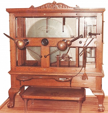 Description: This Oak Framed glass cabinet houses five large glass discs for generating electrostatic current and three small ones in a sub division.There are two brass bulbs mounted on arms that collect the electrostatic charge and deliver the electric current. The various attachments are shown in the illustration from the Charles Lentz Catalogue (ref 36). It is 5’ x 27” deep x 62” wide. At the turn of the century there was a debate about the use of electrostatic machines for generating X-Rays. These machines had been used since the 18th century to provide electric therapy. There were many smaller home versions, but the large ones were used by physicians and could generate a sizable current. They soon disappeared from use as it became apparent that the amount of current they generated was inadequate and alternating current machines took their place. Also shown here is the original small glass X-Ray tube. The patient stood between the tube and the physician who used a hand held fluoroscopic device. There was no shielding, but fortunately the current was low. Among the attachments listed in the catalog are: insulated platform, conductors, leyden jars, crown for static breeze, adjustable holder, concentrator standard, full set of electrodes. A similar Static Machine, shown on another page is said to be “without doubt one of the best and most reliable to be found…….It is also an excellent machine for X-Ray work.” The photo of the patient receiving electric therapy is from Snow (ref193). The primative tube that was used for the machine is on this site.