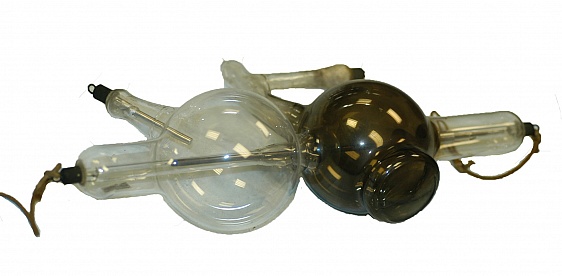 Description: Double tube designed for superficial therapy with X-rays, considerable blackening of the tube from use. The tube is 13” long with two 3” bulbs, one bulb is flattened on one side for application to the skin. There is a simple extension from one bulb and a t shaped extension from the other. This tube was intended to obviate the need for shielding. It is made of lead glass and the two bulbs are meant to allow for the opacity of the bulb and to modify the rate of change in the vacuum. In addition to being used for skin lesions therapy it was also used for light fluoroscopic work and radiography.