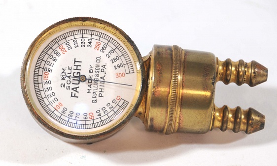 Description: 1.5” circular anaeroid scale, calibrated from 0 to 300 mmHg. Indicated 2 mm scale, Faught and made by G. Pilling. The base has two tubes to connect cuff and insufflater. Patent date on back. There is a ring to attach to a cuff on the back. Gilded. Contained in a leatherette box complete with cuff.