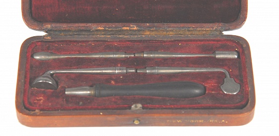 Description: 6.5×3×1” red velvet lined, leather covered brown case. Contains a wooden handle. 3.75 and four screw on cauteries each about 2.75 and representing the basic shapes in use. The cautery portions appear to be made of steel. It is interesting that many medical instruments in the nineteenth century were manufactured by razor companies, probably reflecting their skill in metal work.
