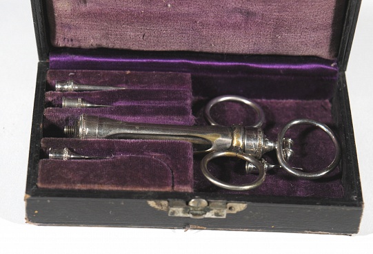 Description: 4.5×3.5×1” black leatherette box with plush purple velvet lining contains a 2.75× 3/8 nickel plated syringe, the metal tube ends in three rings for gripping and unscrews to reveal a glass tube. 5 needles of varied sizes with many original needles missing. Rubber tip on plunger, needles screw onto threaded hub.