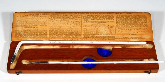 Description: 12“x 2.75“x.5” wooden box of mahogony contains two thermometers each signed. One 10” #8248 straight and the other 10 leading to an almost right angle curve and another 2” #8153. Each thermometer is hand lettered and the directions are pasted onto the lid.
