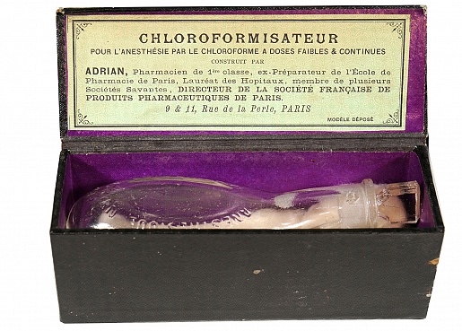 Description: 6“x 2“x 2” black box with label on inside lid Chloroformisateur pour l’anthsie par le chloroforme a doses faibles and continues with testimonial about pharmacist Adrian. Contains a 5” x 1.25“x 1.75” bottle like a nurser with a glass stopper and embossed Chloroform, anesthesique, Adrian, Paris.