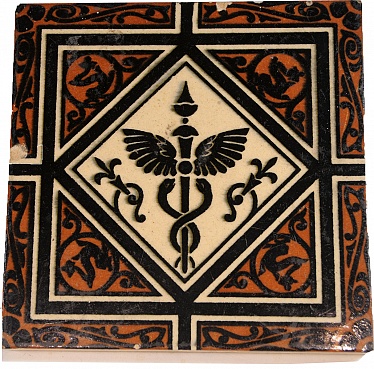 Description: This tile was made by the Minton factory and is fully marked on the reverse MINTONS CHINA WORKS STOKE ON TRENT. I am not certain of the exact date but certainly an S was added to the name Minton in 1871.I think this probably dates from between 1890 and 19 20. It is standard size 6 inches (15cm ) square and is 0.5 ins (1.5cm) thick. There is a tiny chip on the top edge and a nibbled part along one edge( see close ups). The central symbol is a caduceus or Herald’s wand such as that carried by Hermes the messenger God. It is the symbol used by the medical profession.