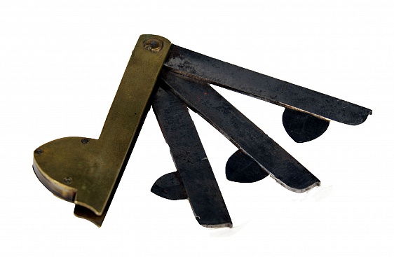 Description: Three bladed brass phleam, 3.5” long. Each blade is 0.75“x 0.75.” Common veterinary type. This was one of the first instruments incorporated into this collection. Although of English origin, it was purchased in New Orleans.