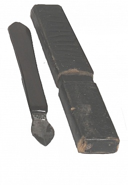 Description: 6.5“x 1“x 1/2” black paper tube contains a 6” instrument with well finished dark oak handle. Blade is trianglular steel and there is a mark E. Faber with a star and a moon ( crescent ).This is from Dr. Porter’s medical bag.