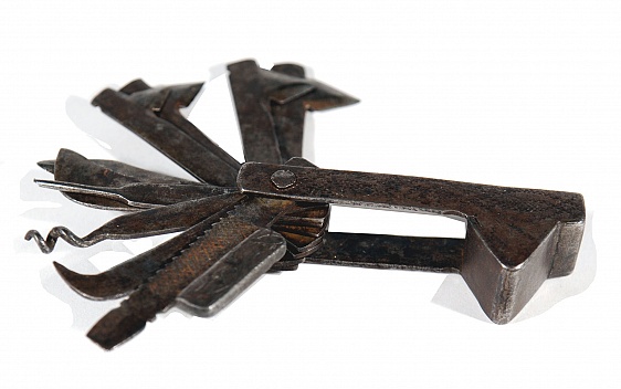 Description: 10 bladed steel phleam, 3“x 0.5” contains 4 phleam type blades, one lancet type blade, 2 curved blades, one file blade, corkscrew and probe all of steel with steel case. The case is ornately engraved and the file blade is also engraved and has a rectangular handle for opening knife. It is inscribed Annozoc. Veterinary or human use? Handmade.