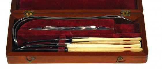 Description: 7.5“x 1.25“x 2.75” red velvet lined walnut case with label for Gemrig inside. Two nickle plated retractors, steel director and four ivory handled knives, two replacements, one labled Tiemann and the other Shepard and Dudley. A transitional set as nickle began to be used but instruments that could not be sterilized properly were still being sold.