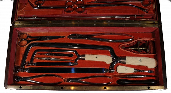 Description: 20.25“x 8.5“x 6.25” walnut chest, escutcheon le Dr. Martin Saint Ange, bound in brass with brass handles on ends. Four layers, top lid :7 pieces, two tourniquets one wooden, one multipiece C clamp ,forceps, needles missing 2 syringes and set of catheters. All of case bound in red velvet. Top layer of lid 14 pieces, 4 cautery, 5 various forceps, trocar, 2 scissors, 3 extractors, file in hidden compartment one empty. Bottom layer has 12 pieces: 1 scissor, 1 tourniquet, 3 forceps, two amputation saws, 3 smaller forceps, one elevator. Top Layer has 25 pieces: 19 various knives, and retractors, one giglie saw, one probe, 1 forceps. This extensive set includes 25 pieces with ivory handles, each cross hatched and with the initials of the owner MSAin highly stylized writing. It is one of the most extensive and exquisite capital operating sets I have encountered. The reference is to a publication by the original owner Martin St Ange who was an embryologist..This is undoubtedly a presentation set for graduation from medical school. The manufacturer is said to have made sets for the personal physician of Napolean Bonaparte.
