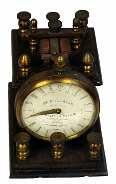 Description: 5“x 2.5” electric coil mounted on a 7“x 4” base. Distinctive is the 4” circular face with a pointer which turns to indicate a changing charge as the coil is extended. 8 lacquered brass fittings. Associated electrodes missing. This is a rather elegant example of a typical nineteenth-twentieth century electric shock machine used to treat a vast variety of ills. The Science Museum has a an interesting example of a trade card advertising this device.