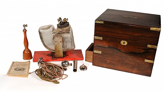Description: 11“x 9.5“x 9” mahogany box with brass corners, escutcheon and drawer on one side. Label with directions on lid, ornate glass wet cell battery, which is turned on by tipping it. Multiple patent dates. Rheostat, posts and current adjuster. Battery can be removed on stand, coil is hidden. Drawer contains instruction book, wires, 3 handles, 2 of wood and metal, metal plates. Extremely ornate set.