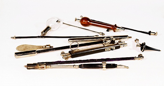 Description: 16“x 8“x 3” purple velvet lined box with two layers contains 16 electrodes for eye, gu and various other orifices in top layer, diagnostic pieces in bottom layer and a grounding plate and 5 cloth sponges and a cautery handle in side compartment.