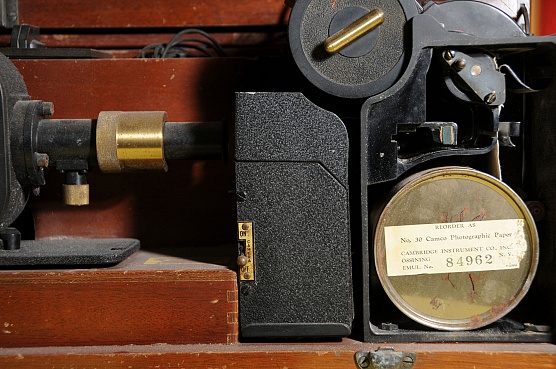 Description: Wooden case contains a string galvanometer with magnets in housing, knob to adjust string. The case is 19” long, 10.5” high and 8” deep. With the top closed the height adds 4”. Light shines through housing to enter a box containing light sensitive paper. A mirror reflects a scale into the box as well and paper advances into a drum, which can be closed and removed. There is a counter. The lowest patent number is 1702650, which corresponds to a date between 1929 and 1930. There is a gear mechanism to advance the photographic paper and a counter and a timer wheel. Some of the original wiring is in the compartments. Extra compartments in the lid of the box are empty but held electrodes and wiring and extra materials. There is an on-off switch in the front of the device.Jump The Dutch physician Willem Einthoven (1860-1927) invented the electrocardiogram (ECG) in 1903 and received the Nobel Prize for the invention in 1924. The abbreviation EKG refers to the German spelling of the name. His device was the string galvanometer that detected the small amounts of current arising from contraction of the heart. The string galvanometer was replaced by the vacuum tube amplifier in the late 1930’s. We now use transistors and solid state circuitry.