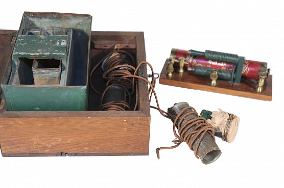 Description: 7.5“x 7“x 5” walnut box contains two compartments,three shells of metal, one probably lead and the other tin for wet cell. 6.5“x 3.75”. The rest of the box houses the coil and accessories. The coil 5.5“x 1” sits on 6.25“x 2.25” wooden platform. Leather covered, red, embossed “electromagnetic machines mnfr by” with magnet at side and 3 posts. Two wooden blocks with cloth, 2 metal handles with sponges and wires.