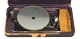 Description: 7“x 3“x 3” leatherette case. Contains 4.5” metal candle holder with threaded bottom, which screws into 2.5” diameter metal base, 6” conical tube with 2” metal base with small thread so base can be used as a reflecting mirror. In the tube there is a plate with 4 holes for insertion of instruments. A compartment contains extra candles and a holder to attach the mirror to the candle stand.