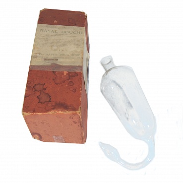 Description: Red cardboard box contains a 6.5” glass reservoir, which curves into a bulbous end for insertion into the nose.