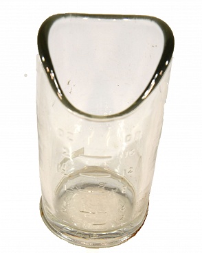 Description: 3.5“high x 1.75“diameter calibrated to 2 oz or 16 dr, of heavy glass with a notch at the top for nose. Base is embossed Mck and R nose cup pat July 2 and Nov 19, 1901.