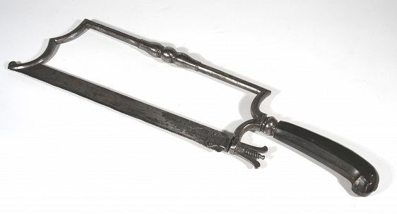 Description: 19” long with 5” horn handle, the saw is held by a u shaped elaboratly scrolled steel holder with a scrolled steel nut to adjust the tension on the blade and a crown shaped end to the blade with the screw for the nut. See more saws here.